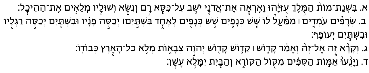He begins with the first cause—God—when he says, “I saw the Lord,” then immediately mentions the upper sphere when he says, “the hem of His clothing filling the Sanctuary.” After that, he returns to speak again about the separate beings—who inhabit the upper sphere— saying, “Seraphim standing above Him,” and then once more speaks of the upper sphere, saying, “the door pillars shook,” and so on. Abarbanel attributes the movement of the door pillars as a cosmic reverberation from what was happening in the upper worlds.