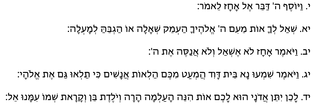 This statement is not consistent inwardly with its outward appearance. For its surface meaning conveys piety and fear of Heaven—as though Ahaz truly believed the words of the prophet and therefore had no need for a sign, since a sign is only requested either to test the prophet or to test God. And since Isaiah was an established and trusted prophet, asking for a sign would indeed amount to testing God.