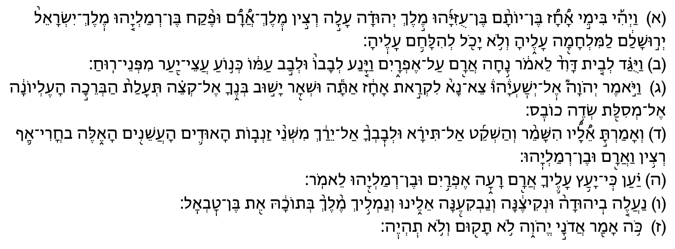 And the matter of this narrative is as follows: because of Ahaz’s wickedness, troubles and evils encountered him. For in the earlier days, the king of Aram, by himself, went up against his land and took from it a great captivity and brought it to Damascus, as is mentioned in Chronicles (II 28:6). And likewise Pekah son of Remalyahu, king of Israel, by himself, went up against the cities of Judah and struck them with a great blow and an enormous captivity, as is also mentioned in Chronicles.