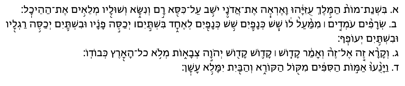 Moreover, in this prophecy we find nothing that is specifically related to Uzziah—neither to his death nor to his leprosy—according to the Targum, he didn’t die, just got leprosy which is considered like a type of death.